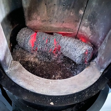 Les bûches cylindriques à base d’un mélange de Myscanthus et de bois compressé forment un bloc de braises qui produit une chaleur douce et durable.